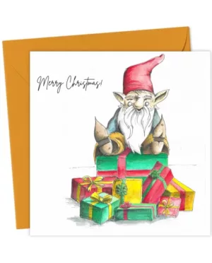 Gnome sitting on pile of Christmas gifts