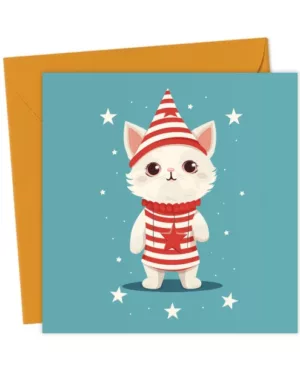 Cute Christmas Cat in Striped Outfit & Party Hat Greeting Card