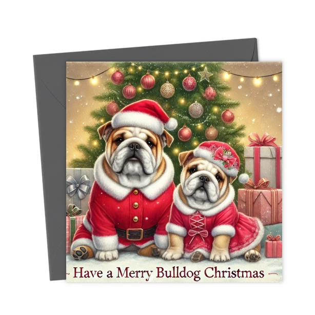 A festive Christmas card featuring two adorable bulldog puppies dressed in Santa outfits beside a glowing tree and presents. Perfect for dog lovers who adore cute, charming holiday bulldog designs.