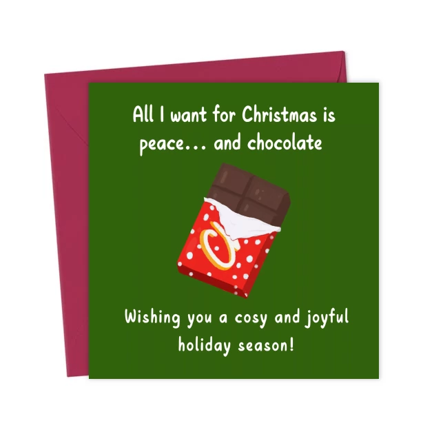 All I want for Christmas is peace… and chocolate. Happy Holidays! – Greetings Card