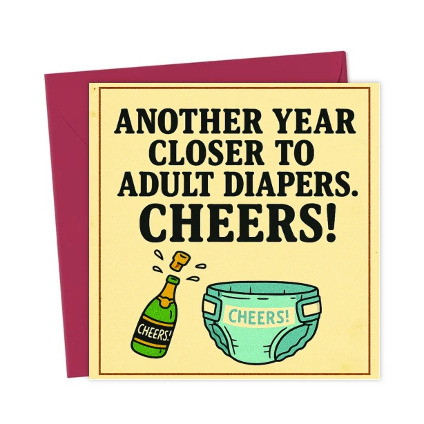 Another Year Closer to Adult Diapers – Funny Birthday Card. Bold, cheeky design perfect for ageing friends. Hilarious milestone humour, vintage style, and guaranteed laughs. Ideal for over-the-hill bi