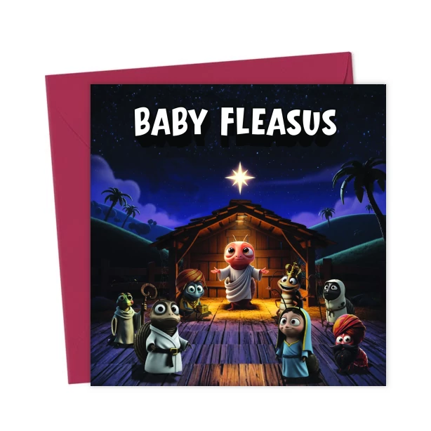 Cute “Baby Fleasus” Funny Insect Nativity Christmas Card – Whimsical Bug Manger Scene, Unique Holiday Greeting for Friends & Family
