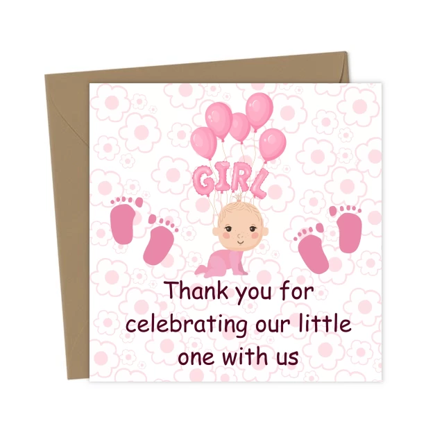 Baby Girl Baby Shower Thank You Card UK – Floral Balloons & Footprints – Greetings Card