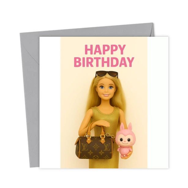 Barbie x Labubu Happy Birthday Card. Send this designer inspired card to your bestie who loves Barbie, designer bags and all things girly.