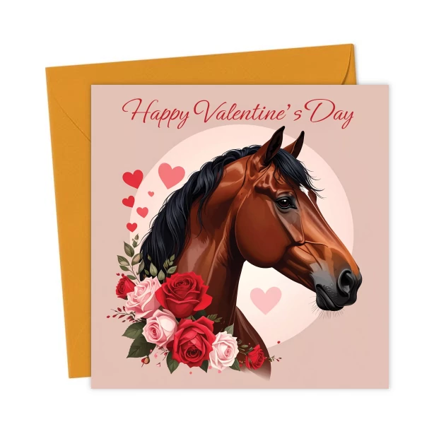 Horse Valentine’s Day card featuring a bay horse with flowing mane, framed by roses and floating hearts, with “Happy Valentine’s Day” at the top. An ideal Valentine’s card for any horse lover.