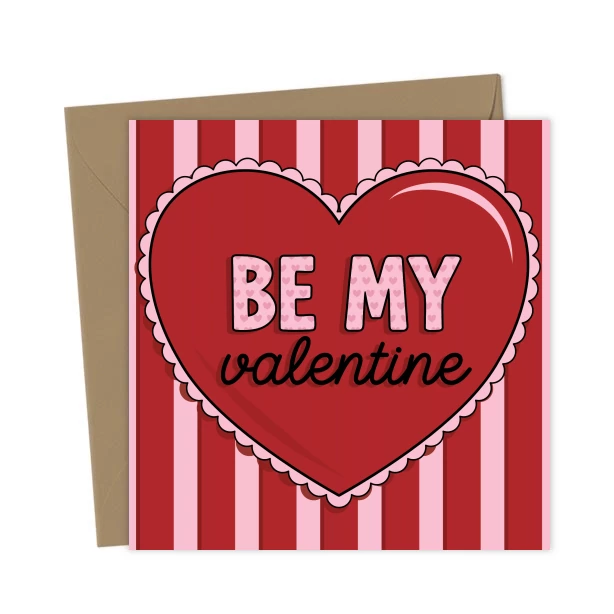 This “Be My Valentine” card features a bold red heart with soft pink details and a fun striped background, it’s perfect for anyone