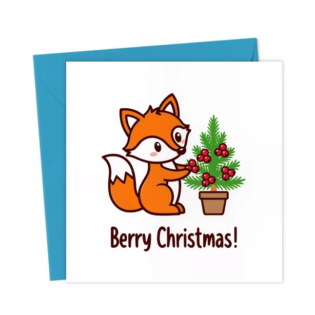 A charming and festive illustration featuring a cute, cartoon-style orange fox with white details, standing beside a small potted Christmas tree adorned with bright red berries.