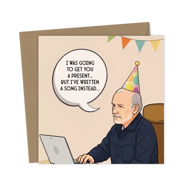 Humorous card featuring Bob Mortimer from Last One Laughing, shown with a laptop and speech bubble: “I was going to get you a present but I’ve written a song instead.”