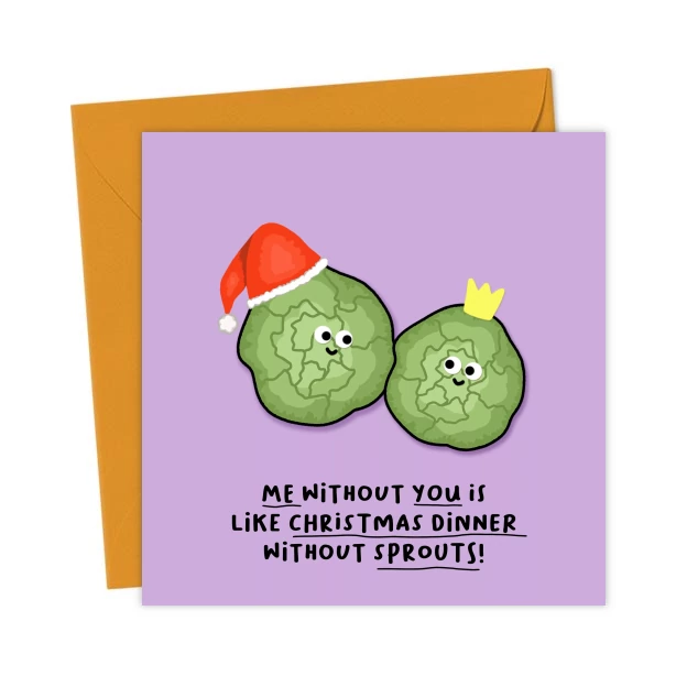This cute food pairing christmas card is perfect to send your partner to let them know just how much they mean to you. Who in their right mind has a christmas dinner with no brussel sprouts?!