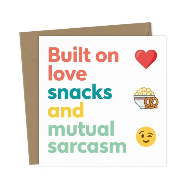 The perfect relationship is always built on love, snacks and sarcasm. Show your appreciation with this modern and truthful valentines/anniversary card.