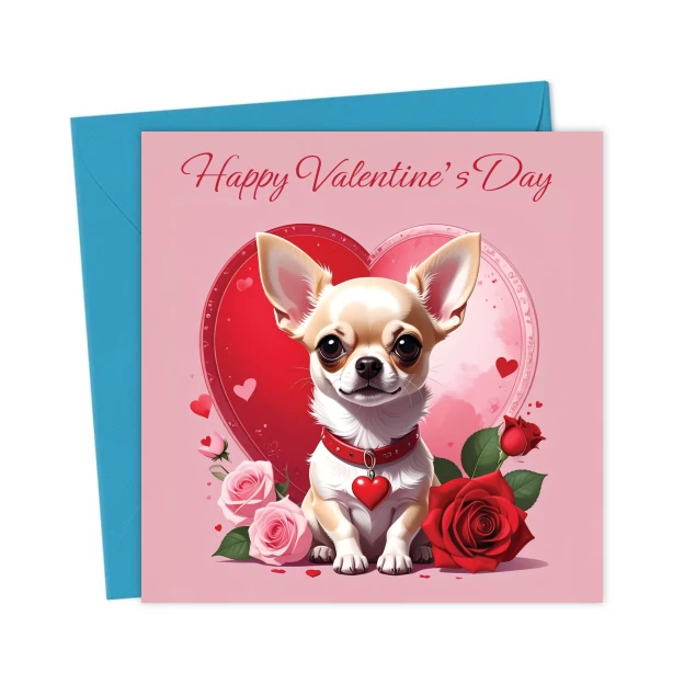 Happy Valentine’s Day card with a Chihuahua sitting in front of a layered red and pink heart backdrop, surrounded by red and blush roses with scattered little hearts.