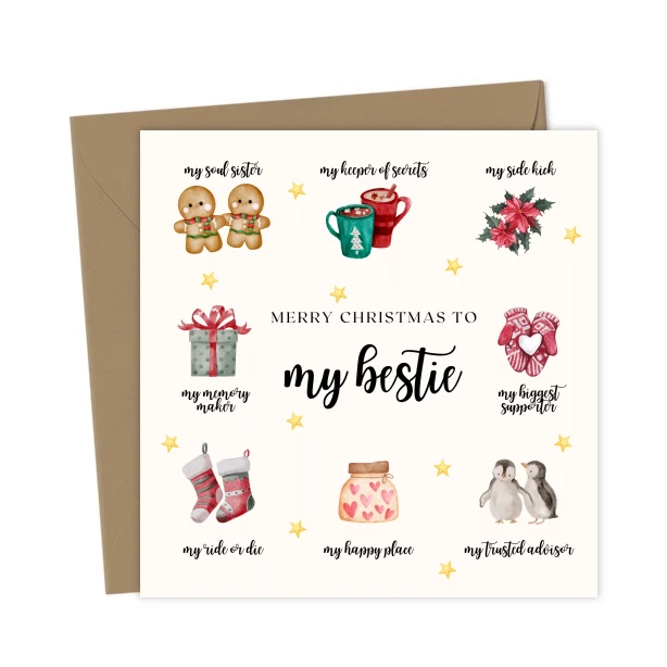 Celebrate your bestie this Christmas with this super sweet festive card! A lovely way to wish your best friend a Merry Christmas; because she’s your memory maker, biggest supporter, and happy place!