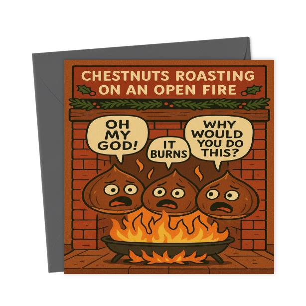 A Christmas classic takes a dark turn when you look at it from the perspective of the chestnuts. Another joke card worthy of being pulled from a bargain basement Christmas cracker!