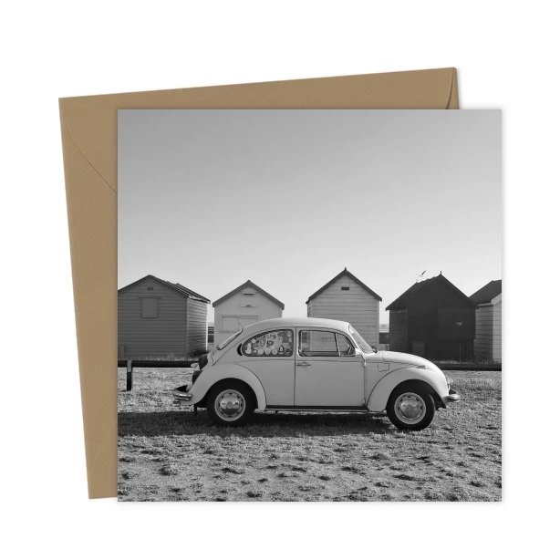 This card showcases a classic VW Beetle set against charming beach huts — ideal for VW lovers and beach dreamers alike. Inside is left blank for a personal message.