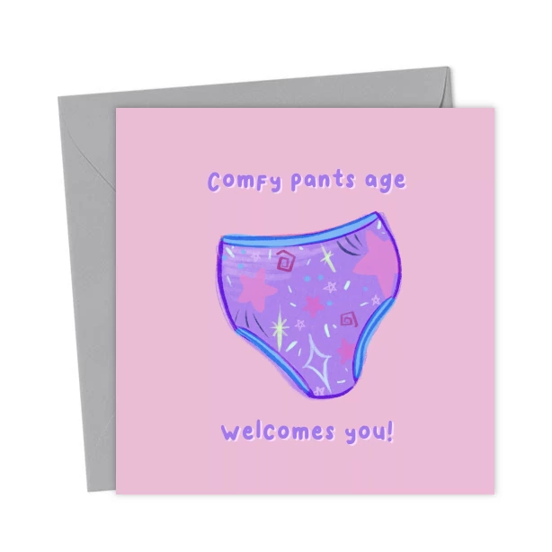 A birthday card with a cheeky statement for those who have reached the age where the Bridget Jones pants are essential. High waisted or go home!