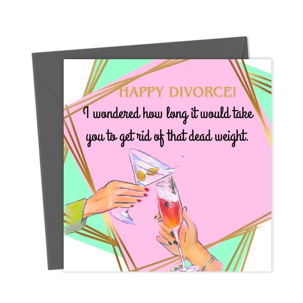 Designed in a classic wedding invitations style divorce congratulations card. Happy divorce, I wondered how long it would take you to get rid of that dead weight.