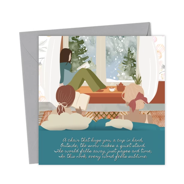 Cozy Winter Reading Card – Snowy Day Book Lovers Illustration – Greetings Card