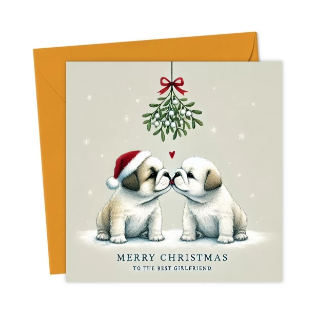 A sweet Christmas card featuring two bulldog puppies sharing a kiss under the mistletoe. Perfect for your girlfriend and ideal for dog lovers who adore cute, romantic holiday puppy designs.