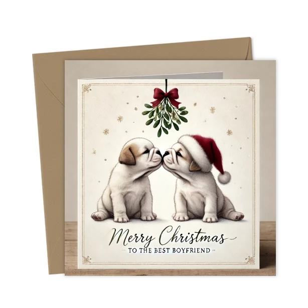 A sweet Christmas card featuring two bulldog puppies sharing a festive kiss under the mistletoe. Perfect for the best boyfriend and ideal for dog lovers who adore romantic, cute holiday puppy designs.