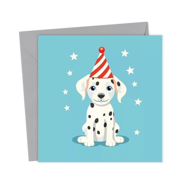 Cute Dalmatian puppy postcard featuring a spotted dog in a red party hat. The perfect animal birthday card and illustration for dog lovers, kids, and pet enthusiasts.