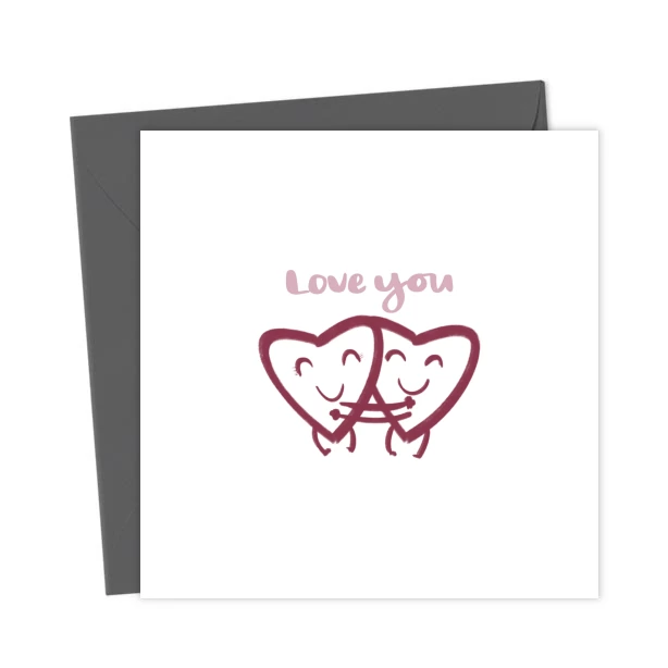 A cute, hand drawn card with two cute hearts in an embrace and Love you lettered above. Perfect card to let that special someone know how you feel, or just to let someone know you love them.