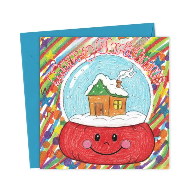 A charming Jellycat-style Christmas card featuring a cute smiling snow globe with a cosy cottage and snowy trees. Perfect for fans of whimsical, cosy, and playful holiday designs.