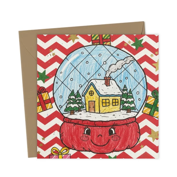 A charming Jellycat-style Christmas card featuring a cute smiling snow globe with a cosy cottage and snowy trees. Perfect for fans of whimsical, cosy, and playful holiday designs.