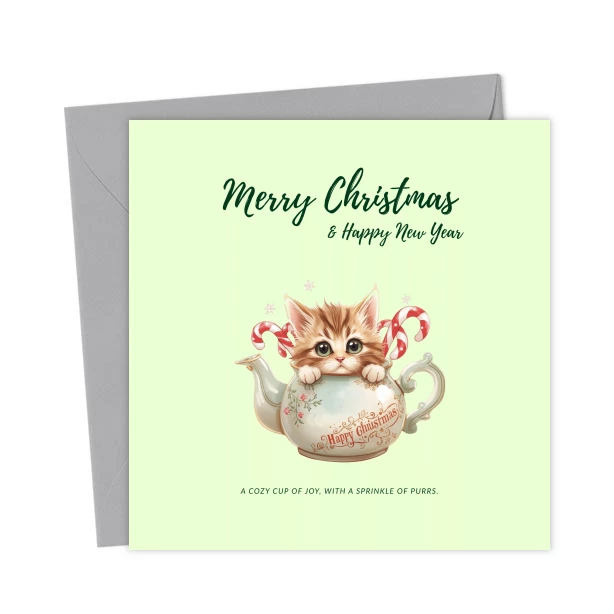 Cute kitten Christmas card featuring a cozy teapot and candy canes. Perfect for cat lovers spreading warmth, joy, and festive cheer. A purrfect holiday greeting full of love and Christmas magic.