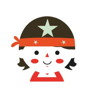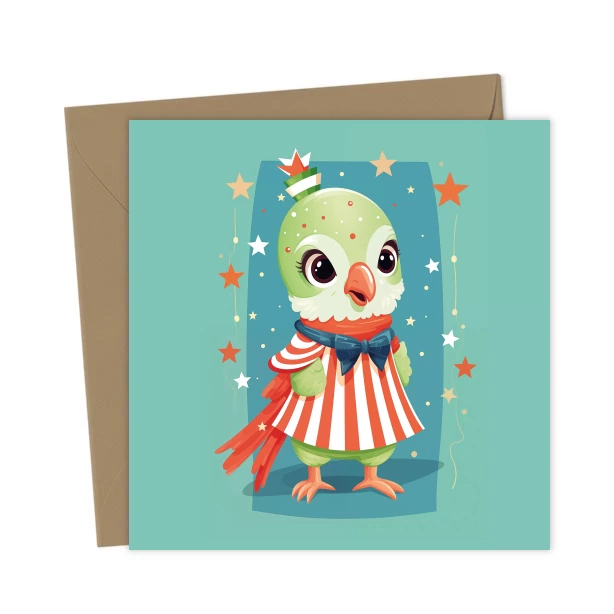 A sweet green parrot wearing a striped circus-style outfit, bow tie, and party hat. Surrounded by stars, this whimsical bird illustration is perfect for vibrant birthdays and fun celebrations.