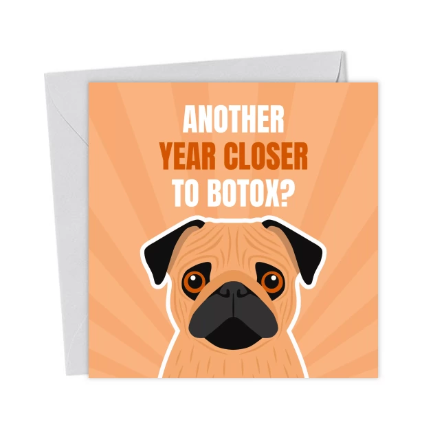 A playful and cute pug themed birthday card gently poking fun at someone being another year closer to Botox. Ideal for dog loving friend and family to celebrate their special day in a fun way.