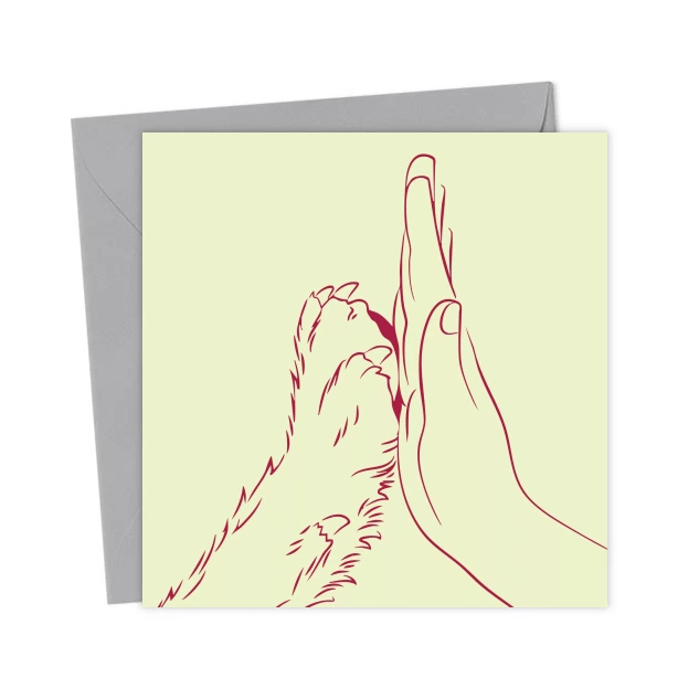 Adorable card featuring a human hand and a dog paw giving a high five. Perfect for dog lovers, friendship, or any occasion to celebrate the special bond between humans and their furry friends