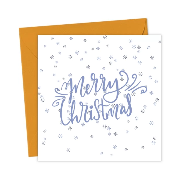 A beautiful white Christmas card adorned with delicate blue snowflakes, featuring a bold “Merry Christmas” caption in the center. Perfect for spreading festive cheer.