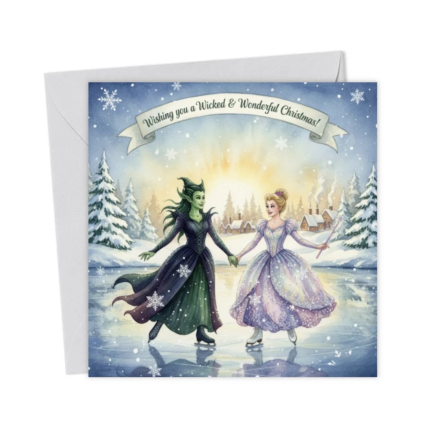 A magical Christmas card featuring Elphaba and Glinda ice skating together in a snowy fairy-tale scene. Perfect for fans of Wicked, fantasy, friendship and enchanting holiday designs.