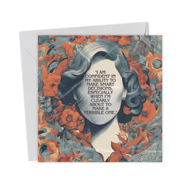 A faceless lady illustration with the caption: “I am confident in my ability to make smart decisions, especially when I’m clearly about to make a terrible one.” Perfect for humor and self-awareness.