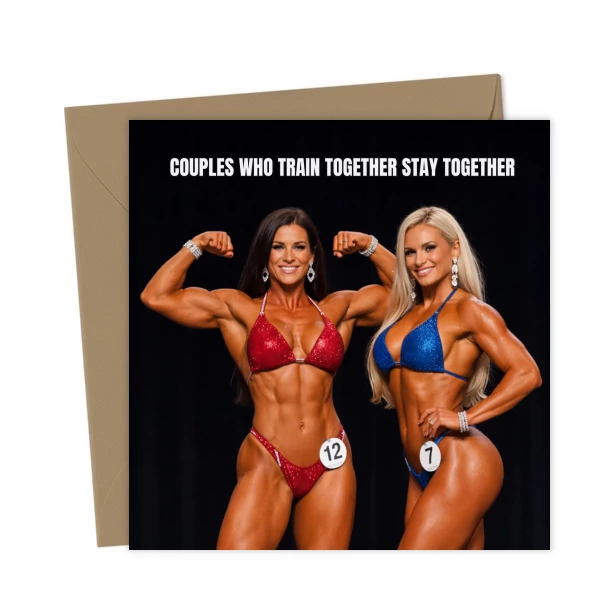 A personalised female body builder couple anniversary or Valentine’s Day card with face swap. Upload two photos to create a photo-realistic keepsake for your partner or spouse.