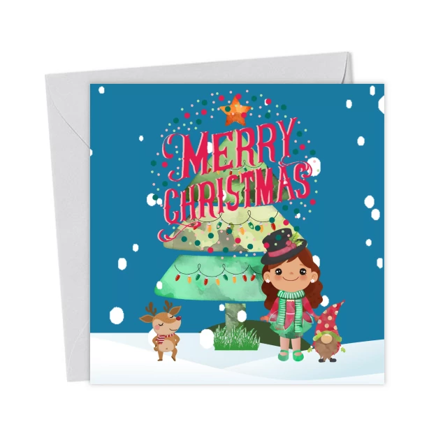 Festive Christmas Card – Tree, Gnome, Girl, and Reindeer in Snow – Greetings Card