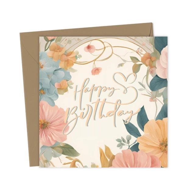 Floral Happy Birthday Card – Beautiful Flowers and Heart – Greetings Card