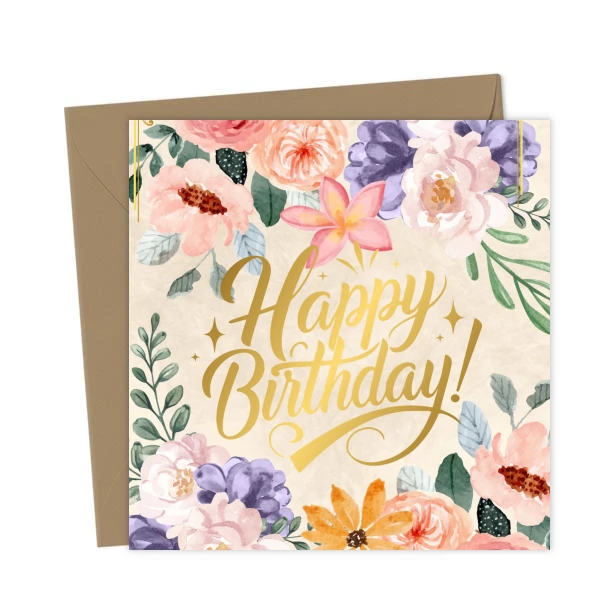 Elegant birthday card with a big, bold “Happy Birthday” sign surrounded by vibrant, beautiful flowers. Perfect for celebrating special moments with elegance and charm.