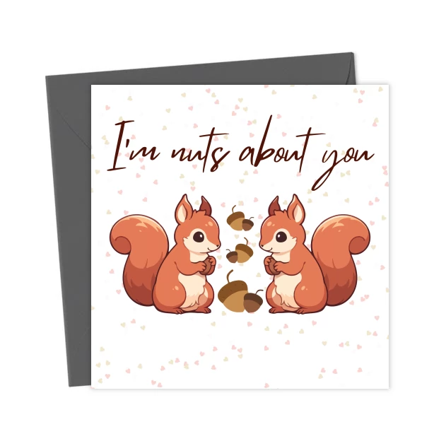 Show your affection in a nutty way with this “I’m Nuts About You” pun card. Ideal for girlfriend, boyfriend husband, wife, fiancé or partner, lighthearted, charming, and memorable. Great for couples.