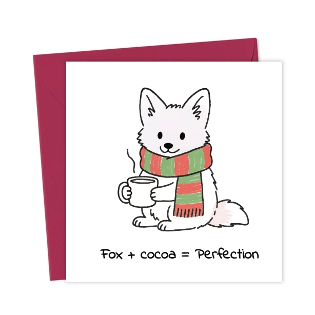 This Christmas greeting card shows a sweet snow fox cub wearing a scarf and holding a mug of comforting cocoa. The text below reads, “Fox + cocoa = Perfection.”