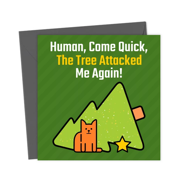 Send your friends and family this funny and cute cat Christmas card featuring a cat doing what cats do best, cause chaos, even at the most festive time of the year.