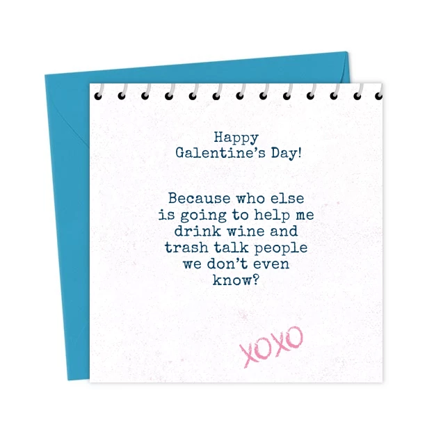 A playful Galentine’s Day card with the caption: “Because who else is going to help me drink wine and trash talk people who don’t even know. XOXO.” Perfect for your bestie.