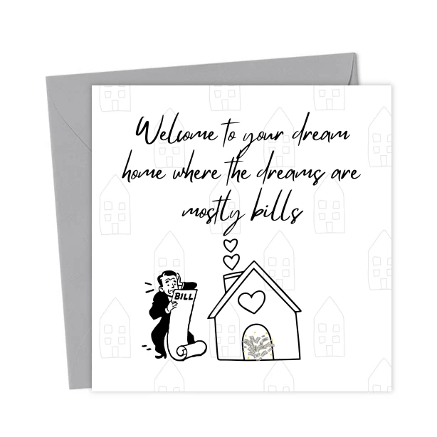 Share a laugh with this funny new home card featuring the line, “Welcome to your dream home where the dreams are mostly bills.” Perfect for friends, family and colleagues with a sense of humor.