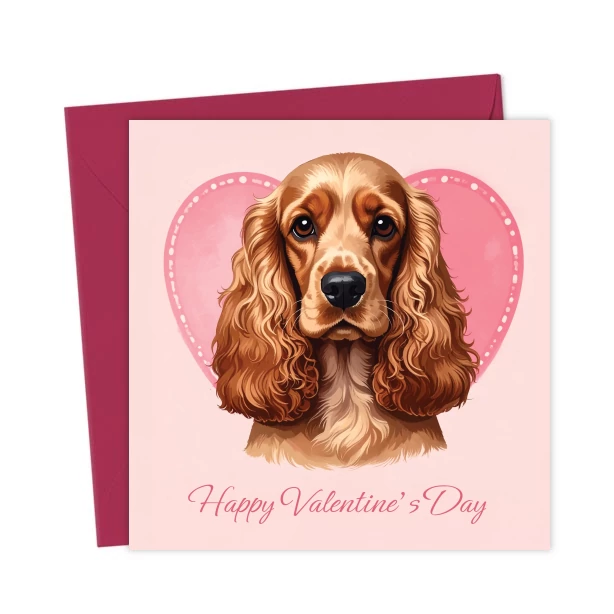 Happy Valentine’s Day card featuring a golden Cocker Spaniel set against a pink heart on a soft blush background. An ideal Valentine’s card for a cocker spaniel lover.
