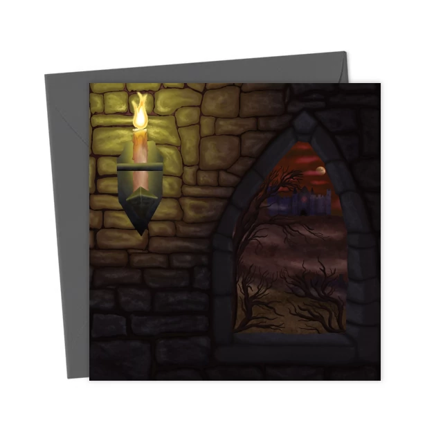 Gothic Castle Cobblestone Window Candle Cathedral Scene Card – Greetings Card