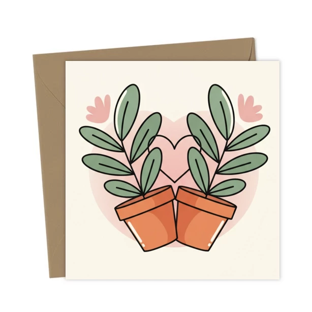 Cute card featuring two plants leaning toward each other with a heart in the background. Perfect for Valentine’s Day, anniversaries, or any occasion to celebrate love and connection