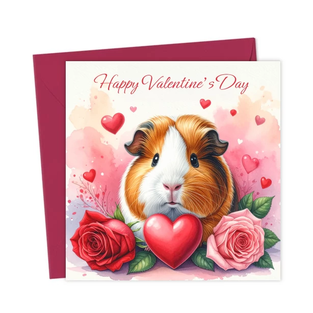 Happy Valentine’s Day guinea pig card with a cute guinea pig, red heart and roses. An ideal Valentine’s card for a guinea pig lover.