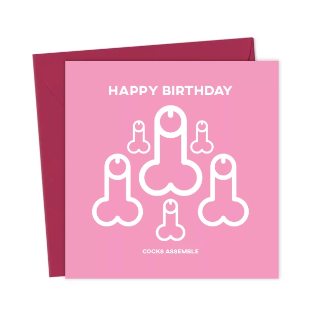 A beautifully designed cock motif card portraying you and your Cock mates assembling like the Avengers to party in to the night, cocks in hand.