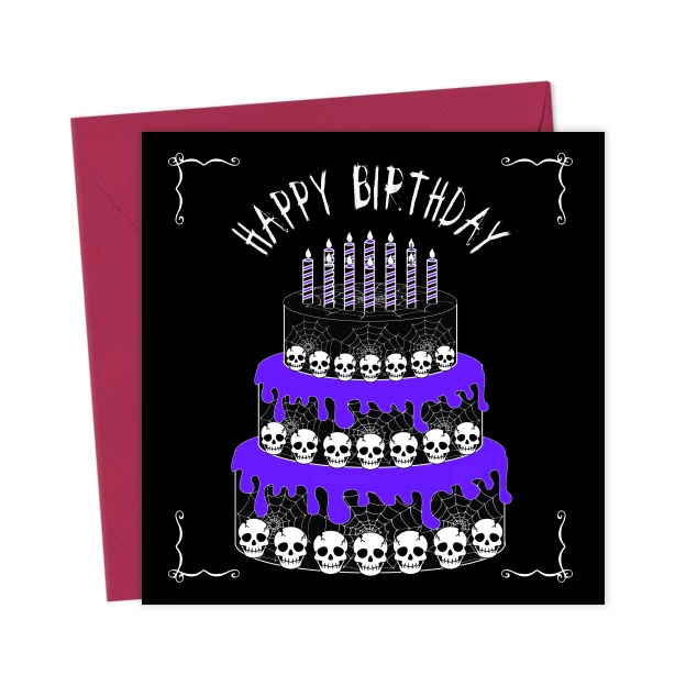 Goths, EMOs and horror movie fans will appreciate this gothic birthday card. It features a tiered black birthday cake with candles, dripping purple icing, decorated with creepy white skulls