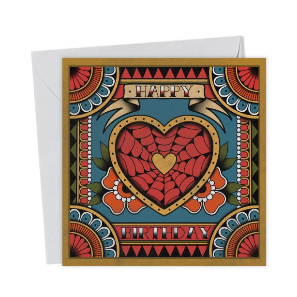 Celebrate birthdays the bold way with this traditional tattoo-inspired birthday card, featuring a striking red heart surrounded by classic flash-style petals, bold linework and banner lettering